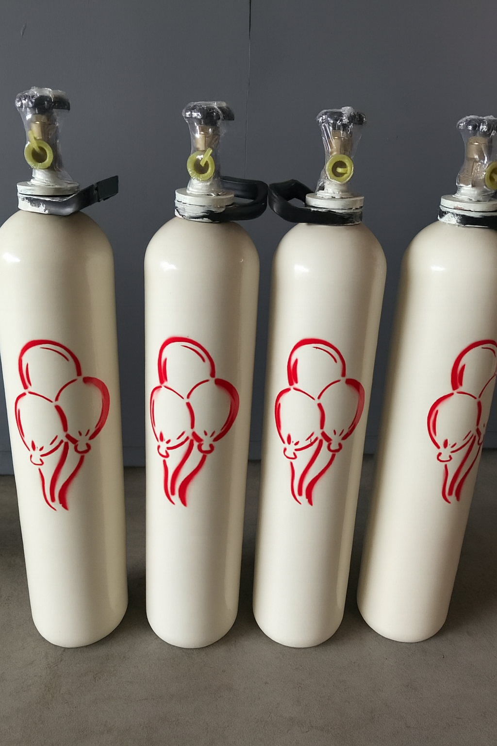 Balloon-grade helium cylinders commonly used for inflating party balloons at events, retail outlets, and decoration services. Each cylinder is fitted with a protective valve cap and features the standard red balloon symbol for easy identification. These cylinders are pressurized and designed for safe transport and handling, providing a reliable source of helium for party and commercial balloon inflation.